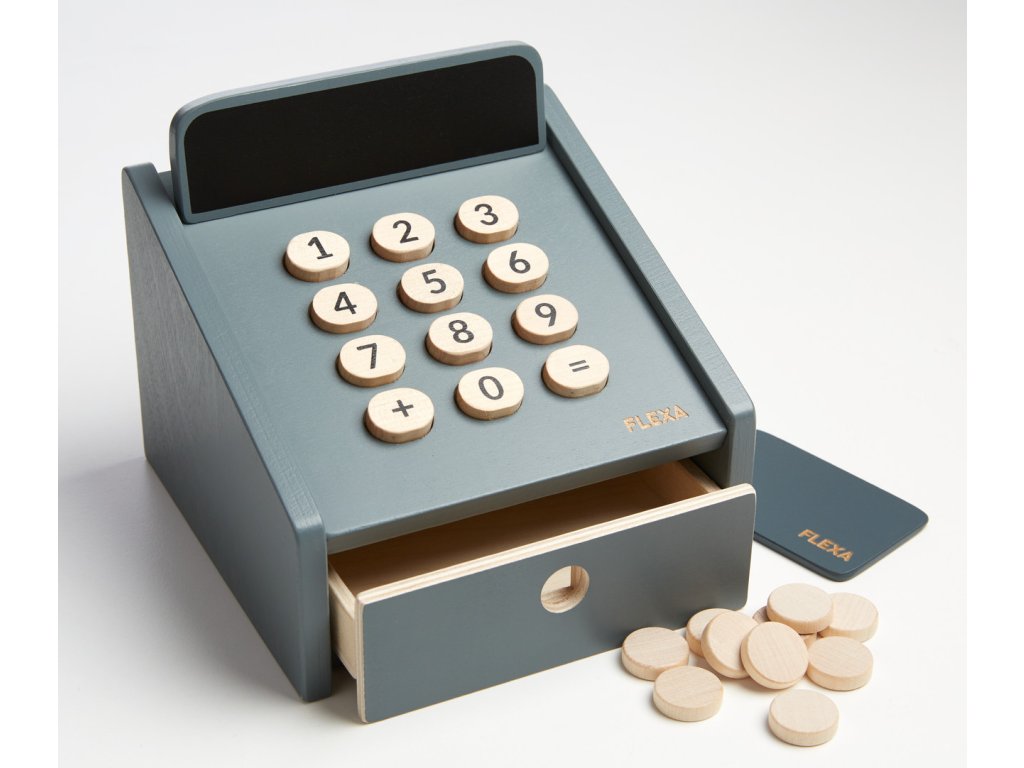 Zahrnuje číslovaná tlačítka, zásuvku na mince, malou tabuli na zapisování cen, dřevěné mince a kreditní kartu.